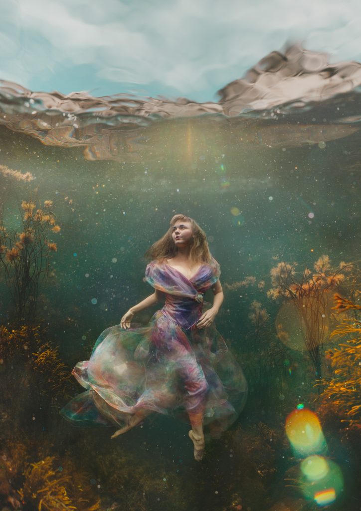 As well as creating works of art around nudes, Lexi also experiments with how fabric behaves in the water by shooting her models wearing dresses. “I think the way fabric behaves lends itself to the aesthetic that I really like, especially painting from the baroque period of art,” she says. “I think the way the light can hit fabric and water looks heavenly, like the Italian frescoes on the ceilings of grand old churches.”