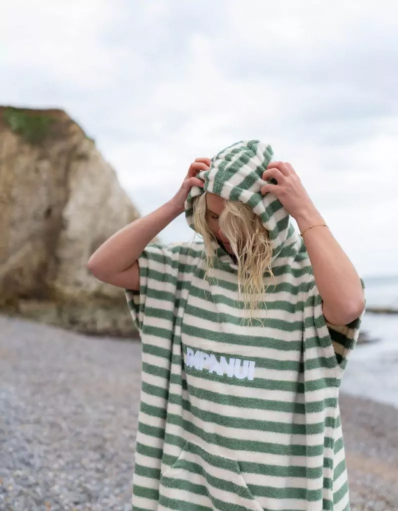 They say: Meet the limited edition of our iconic surf towel in fresh beach stripes. Whether warming up after a sea swim or changing out of your wetsuit, this surf towel will keep you cosy. The surf towel features thick and absorbent organic cotton terry-loop towelling, roomy hood, cosy hand-hugging pocket and is the perfect length for changing. Made powered by renewable energy, our drying changing robe is soft, warm, cosy and sustainable.